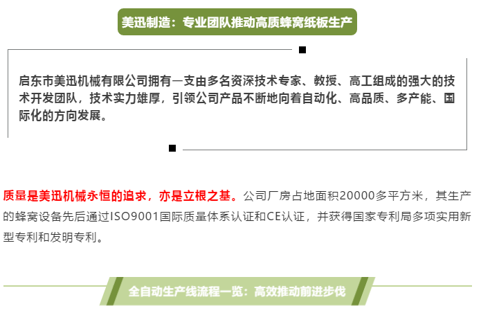 Meixun Machinery from Zhejiang (former Ruian Ying machinery) factory after 18 years of development, is the earliest manufacturer of automatic honeycomb paperboard continuous production line enterprises, has a number of senior technical experts, professors, high workers composed of a strong technical development team, strong technical strength, In recent years, it has embarked on the fast track of development with the continuous accumulation of manufacturing experience and cutting-edge technological advantages: