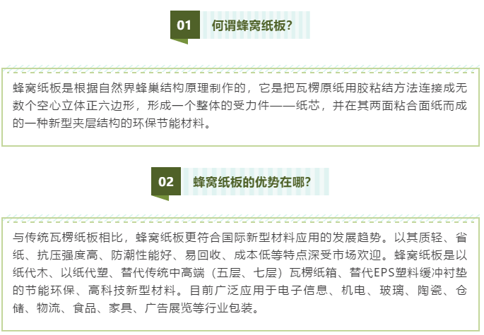 In recent years, the international call to protect the environment, care for the earth, save resources is getting higher and higher, overseas markets for foreign trade products packaging requirements are becoming more and more stringent, pay attention to the protection of the ecological environment, research and development, production, publicity, promotion and application"Green Packaging"Material is imminent, paper honeycomb products as the first choice of wood application materials, has obtained a unique opportunity for development.